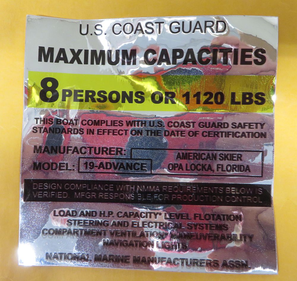 This is the OEM USCG replacement Capacity Decal located ahead of the throttle for all Advance 19' models. Please replace yours if it is no longer legible.