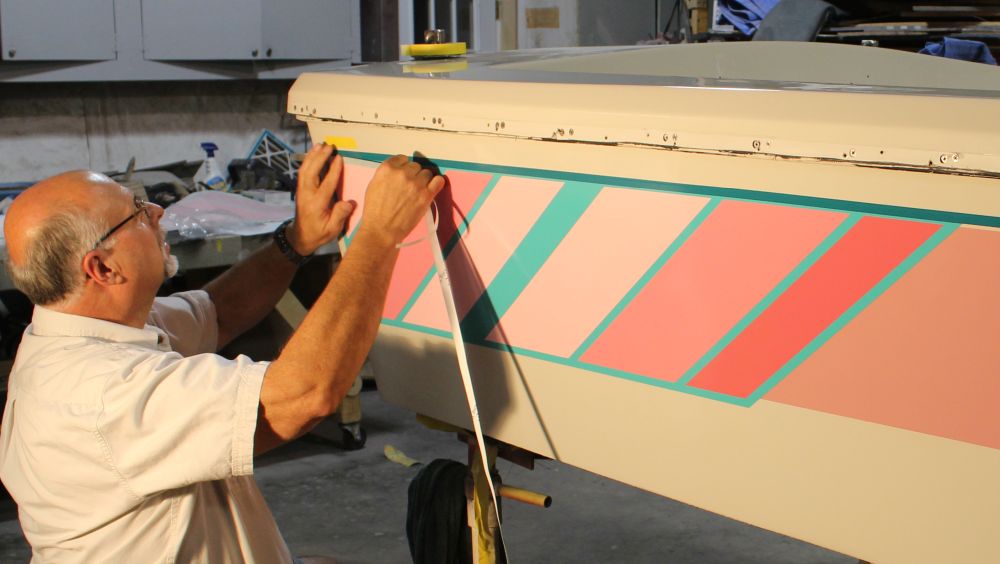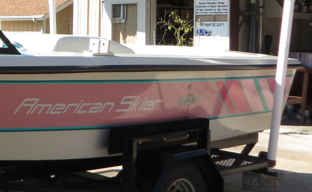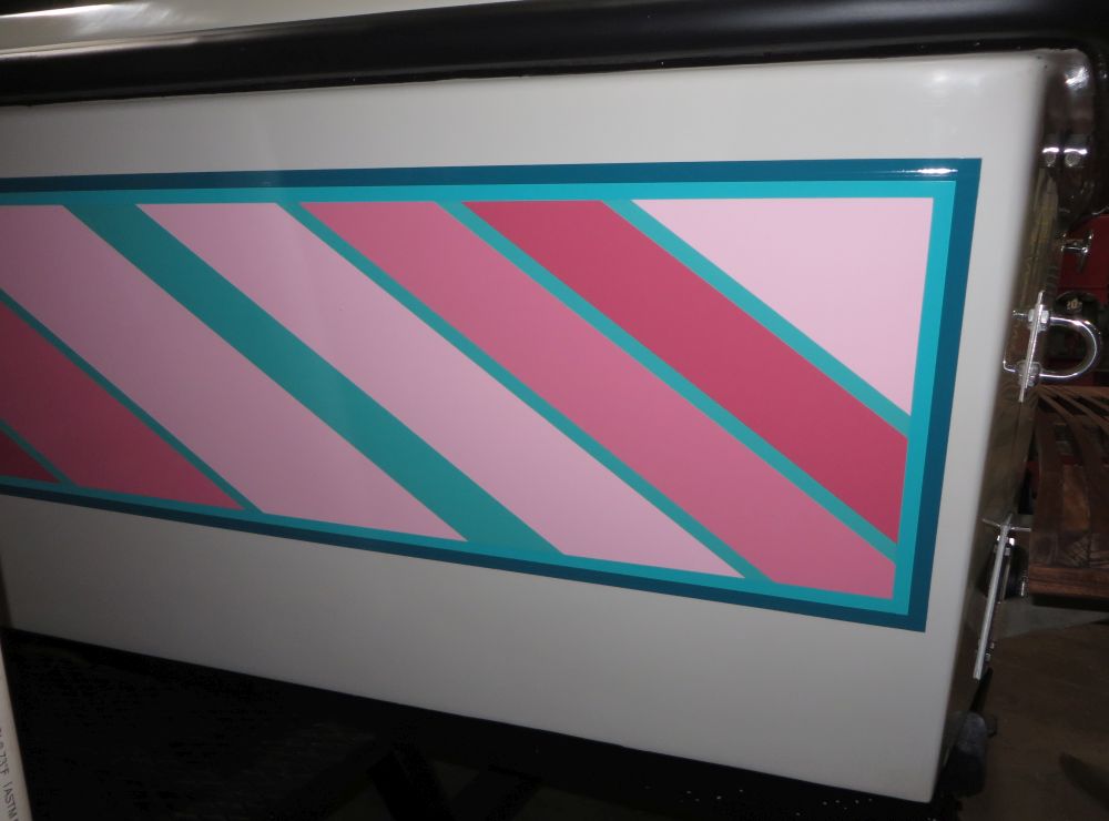 OEM replacement decals for the American Skier "DECO" edition of the 19' Advance. This is for a Port & Stb. SET of rear hull side "sweeps" decals, the pink & teals diagonal stripes from the original Deco boats. NOTE that these "sweeps" decals had additional 1/2" tape stripes that were applied over the top. bottom, back edges and ran forward to the bow.  This 1/2" tape is currently not available, we are searching for a replacement tape.