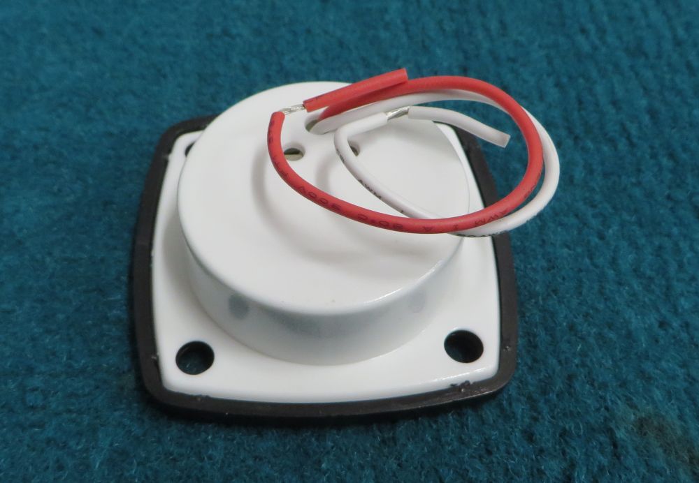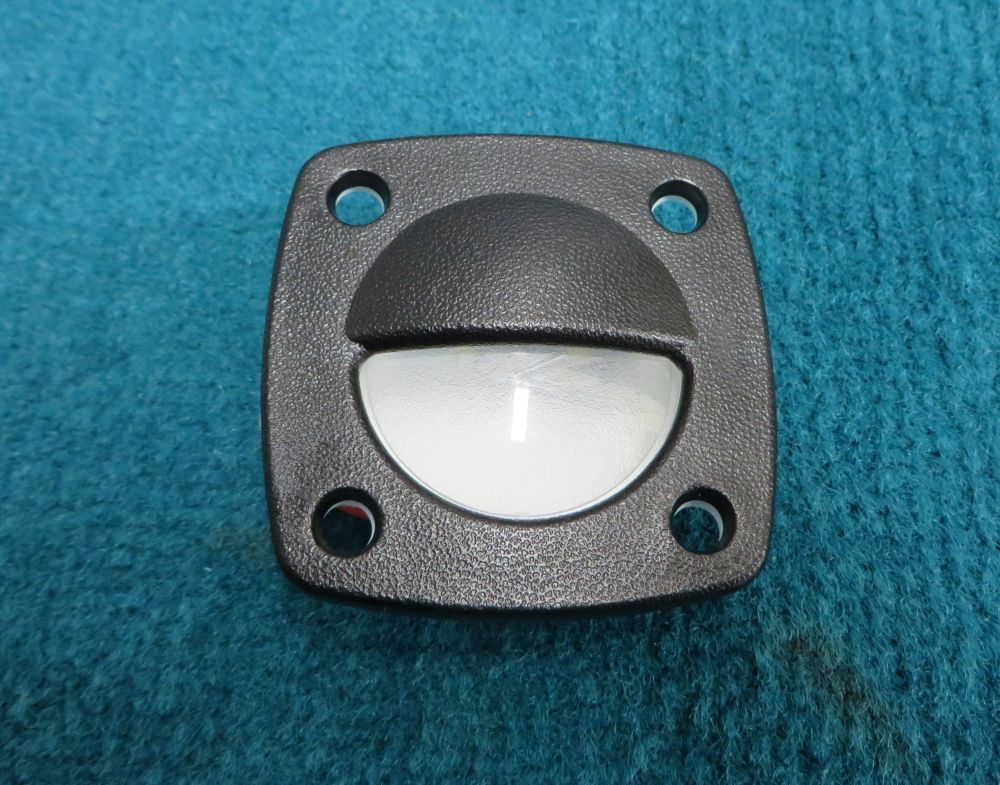 Black frame approx. 2 1/4" x 2 1/4" uses a 1 3/4" round hole for mounting, common interior light in older ski boats, originally had incandescent bulbs, this is an LED version of the same light.