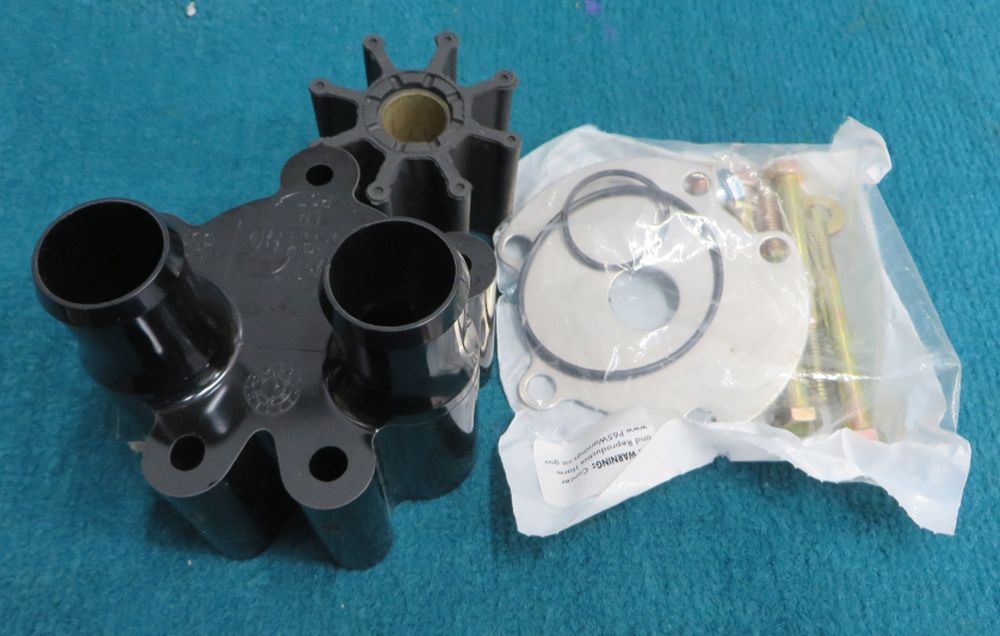 Mercruiser Raw water pump housing kit includes new plastic housing, impeller, stainless backing plate, bolts, o-rings/gaskets