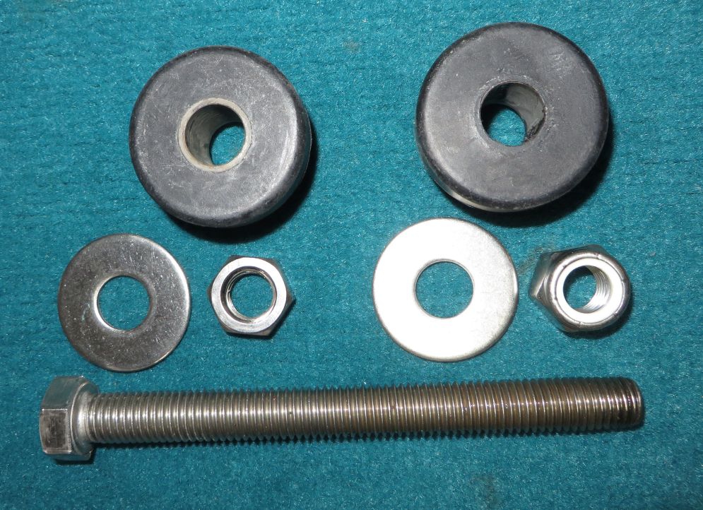 Kit includes: (1) Stainless Steel 5/8" bolt, (2) SS washers, (1) SS Locknut, (1) SS Jam Nut, (2) new rubber bushings with steel sleeves