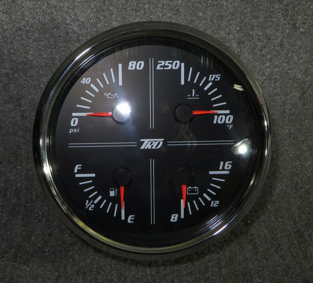 TRD  Marine 5" Analog Multi-Gauge  Features Red or Yellow LED back-lighting, Stainless Steel trim ring, Multi-Pin wire connector (plug w/15" wires included) Threaded collar mounting with rubber gasket, no tools needed to mount, just thread the collar on and tighten by hand, no tiny nuts & lock-washers to drop & lose!