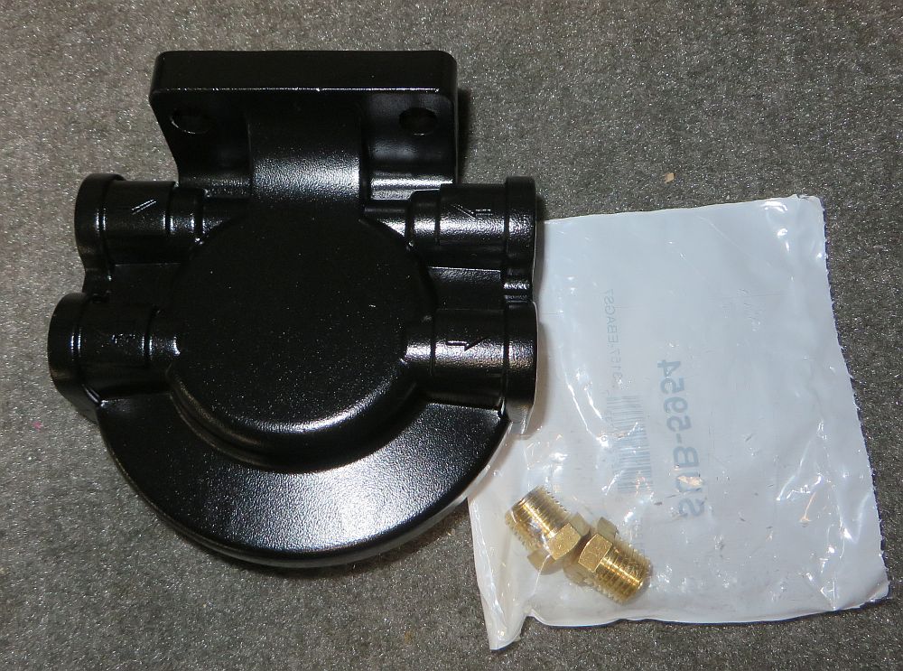 Spin-on Fuel filter housing, includes right and left inlets & outlets (4) comes with (2) plugs, you supply the straight or elbow fittings for your fuel hose. Most ski boats use 3/8" fuel hose.